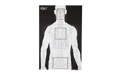The Action Target VTACP100 V-TAC double-sided paper target provides two training patterns on a single extra-heavy sheet for sighting and marksmanship practice. One side features a silhouette with a visible skeletal overlay; the reverse side includes a marksmanship layout with multiple bull’s-eye targets. Sheets are printed in black, gray and white on heavy paper and sized to fit common range setups.