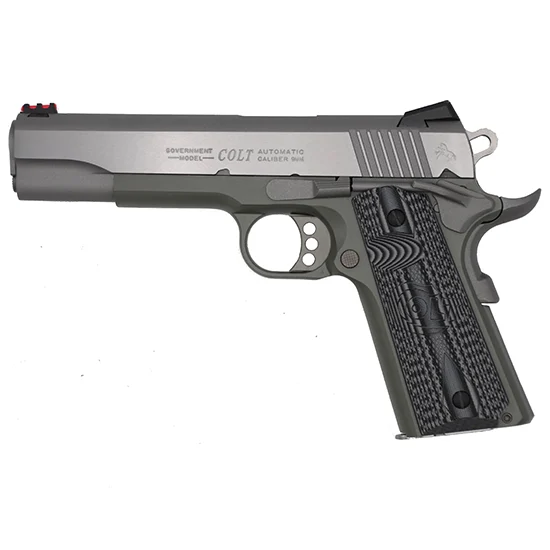 The Colt CLT GOVT 9MM 5 SERIES 70 JUNGLE GREEN SS SLIDE is a single-action, semi-automatic pistol chambered in 9mm. It pairs a stainless steel slide with a Jungle Green Cerakote frame and is configured for a 5 barrel length with a 9 + 1 capacity. Novak adjustable fiber optic sights and a National Match barrel are among the factory features.