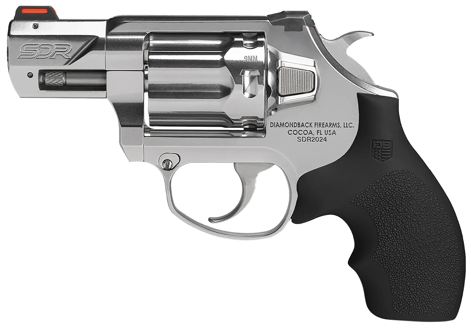 The Diamondback SDR is a compact 9mm double/single-action revolver with a polished stainless finish, six-round cylinder, Hogue black rubber grip, and fiber-optic sights suitable for concealed carry and personal defense.