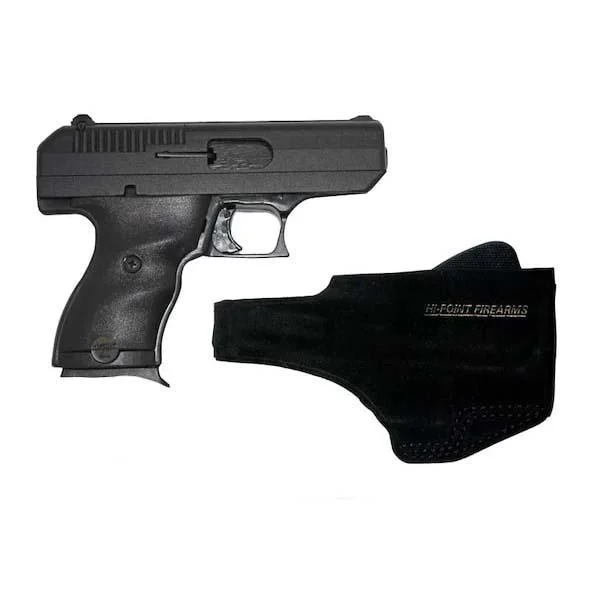 The Hi-Point 916G C9 is a compact, polymer-frame 9mm pistol packaged with a Galco leather holster for right-hand carry. It features a 3.5″ steel barrel, user-adjustable sights, and standard magazine capacity listed in manufacturer materials. The design emphasizes straightforward operation, durability, and simple maintenance for everyday carry or backup use.