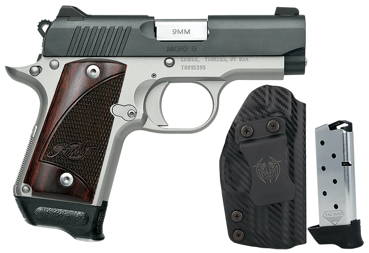 The Kimber Micro 9 RTC is a compact, 1911-inspired single-action 9mm pistol designed for concealed carry and everyday carry roles where ergonomics and a short, crisp trigger pull matter. It pairs a satin silver aluminum frame with a matte black serrated steel slide and classic rosewood grips for a refined two-tone appearance. The design uses match-grade stainless steel barrel construction and 1911-style controls to provide familiar handling in a small package.