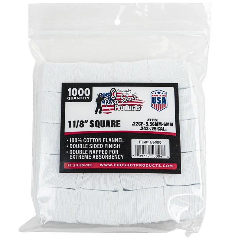 Pro-Shot 1 1/8-inch square cleaning patches are made from 100% cotton flannel and sized for routine bore maintenance in .22 to .270 caliber firearms. These patches are finished on both sides for improved absorbency and are milled in the U.S. to Pro-Shot specifications. Packaged in a reusable zipper-top bag, they are designed for use with a wide range of solvents and common cleaning tools.