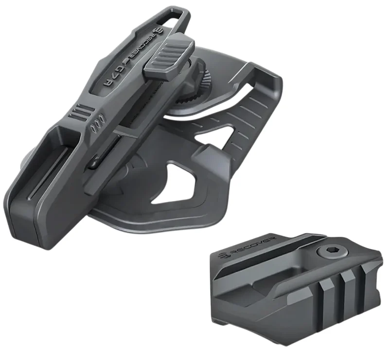 The Recover Innovations MG4502 Angled Mag Pouch is a polymer double-stack magazine carrier designed for use with Glock double-stack magazines chambered in 45 ACP and 10mm Auto. It mounts with a locking push button interface and includes a witness window to verify magazine presence. The pouch is finished in tan and is compatible with Picatinny rails.