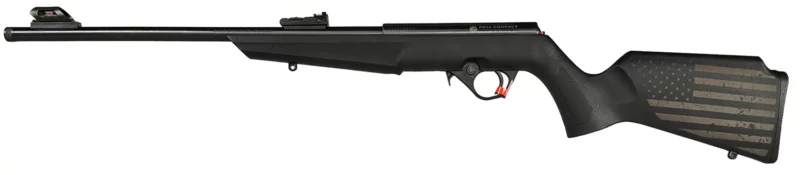 The Rossi RB22 Compact is a rimfire rifle chambered in .22 LR designed for portability and straightforward handling. It features a threaded 16.50″ barrel and a US flag synthetic fixed stock mounted on a black aluminum receiver. The rifle’s configuration and features make it suitable for range plinking, small-pest control and training new shooters.