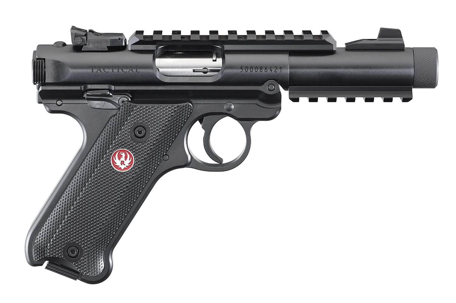 The Ruger Mark IV Tactical is a rimfire, semi-automatic pistol chambered in .22 Long Rifle with a 4.4″ threaded barrel. It ships with top and bottom Picatinny rails and two 10-round removable magazines for accessory mounting and extended range use. The design includes a simple one-button takedown that lets the upper receiver tilt up and off the grip frame for straightforward field-stripping and cleaning.