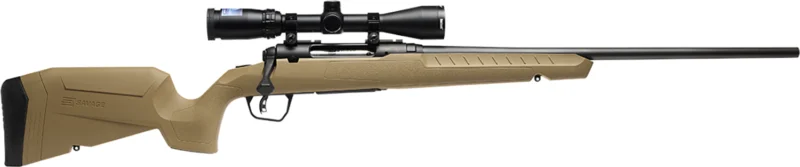 The Savage Axis 2 XP is a bolt-action sporting rifle configured as a factory combo for field use. It ships with a 3-9×40 scope mounted and boresighted, a user-adjustable AccuTrigger, and a detachable 4-round magazine for straightforward operation. The fixed Flat Dark Earth synthetic stock and a 22 inch sporter barrel make this model suitable for general hunting and range applications.