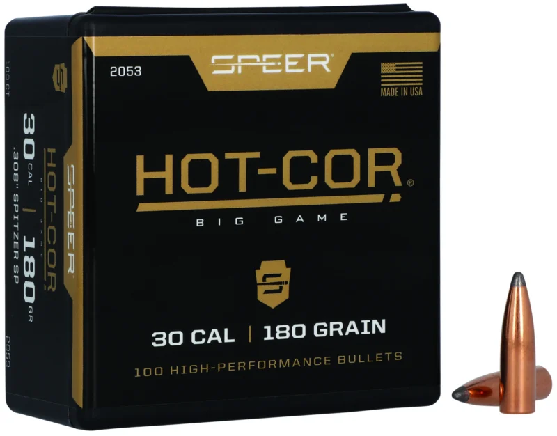 Speer Hot-Cor 2053 Spitzer Soft Point bullets are designed for consistent construction and dependable external performance for reloading applications. The Hot-Cor process pours molten lead into the jacket during manufacture to promote uniformity and cost-effective production. These bullets suit reloaders focused on hunting and precision target use.