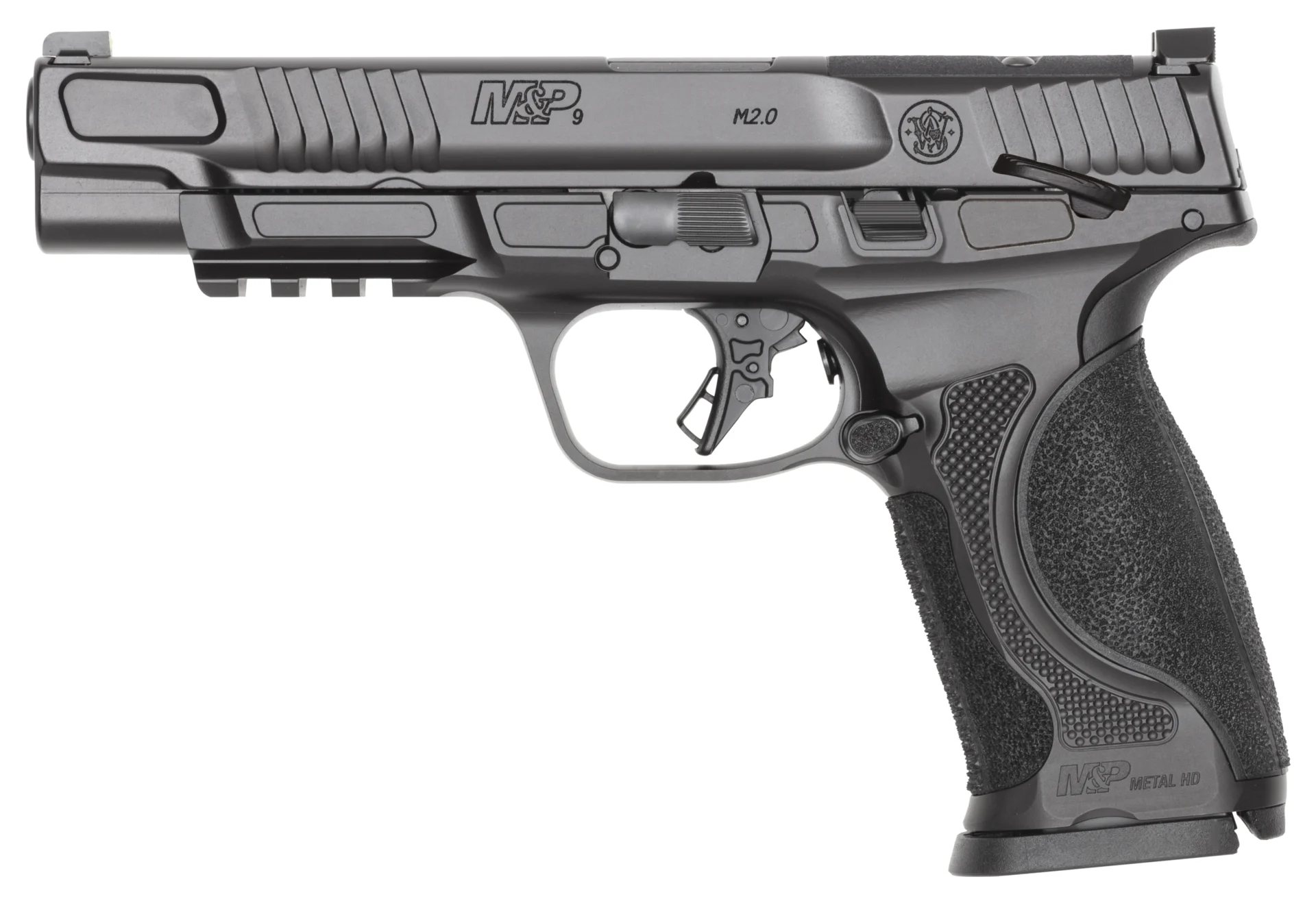The Smith & Wesson M&P9 M2.0 Metal HD is a full-size 9mm handgun built on a stainless steel Armornite-finished frame with a 5in stainless steel barrel and an optics-ready slide. It pairs an aggressive frame texture and a flat-faced trigger with a Night Fision tritium front sight and a blacked-out U-notch rear sight for consistent sighting. This Metal HD configuration ships with two 17‑round magazines and includes a manual thumb safety for additional user control.