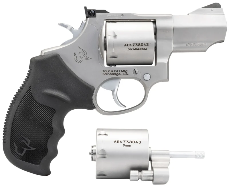 The Taurus 692 is a medium-frame, multi-caliber revolver that accepts .357 Magnum, .38 Special +P and 9mm Luger via cylinder swap. It features a seven-round capacity, DA/SA action, matte stainless finish, adjustable rear sight, and transfer bar safet