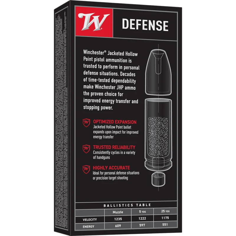 Backed by Winchester’s USA ammunition line, this jacketed hollow point offering pairs brass cases and reloadable cartridge construction with published muzzle performance for defensive applications, and is available in both single-box and bulk case quantities.